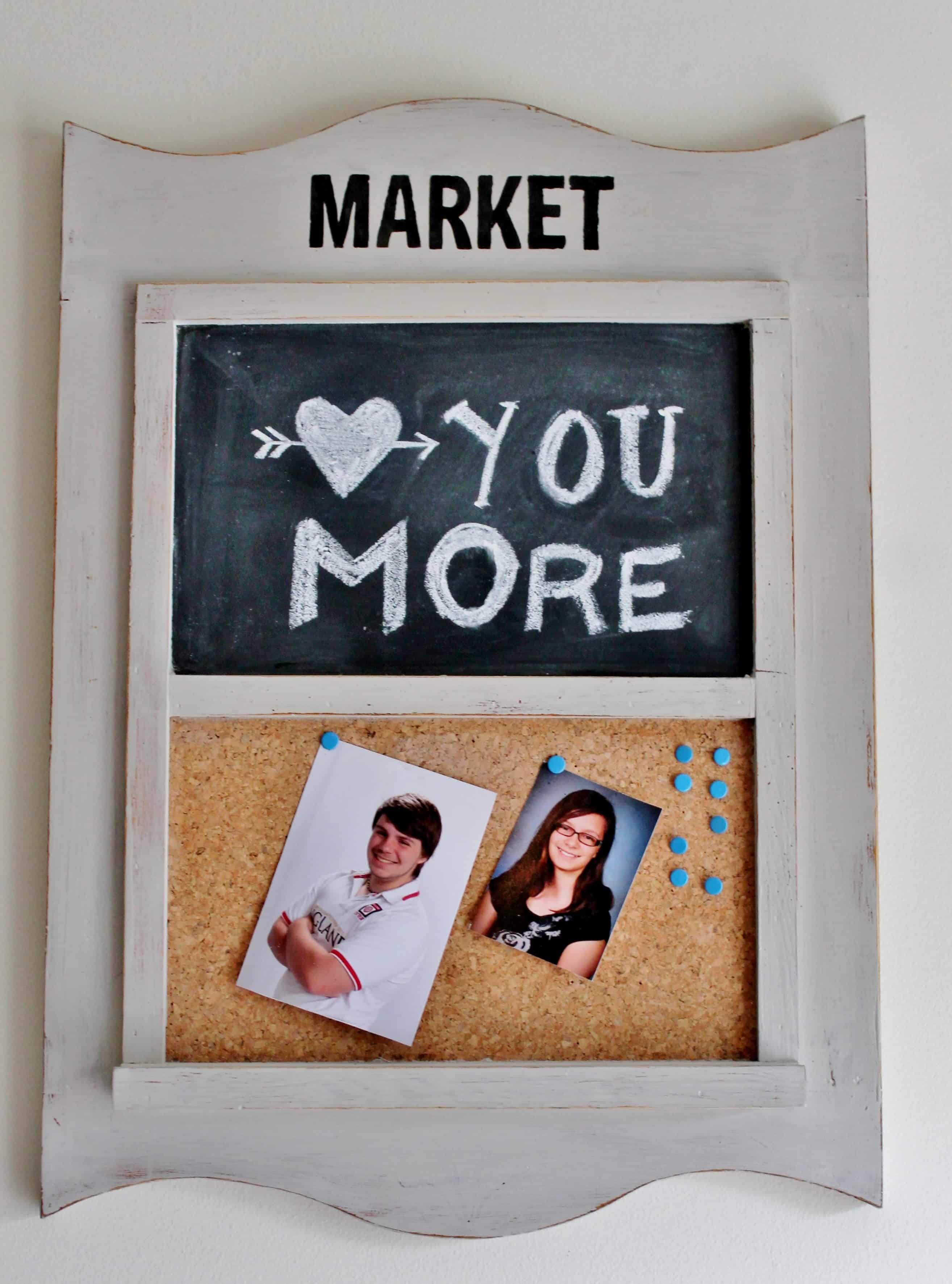Hi everyone! A few weeks ago I picked up an old, dated looking message board at Goodwill. Made of pine (stained a lovely shade of orange), it sported both a chalkboard and a bulletin board. It’s a pretty handy piece, but one badly in need of a face lift, something that could turn it into an attractive message center.