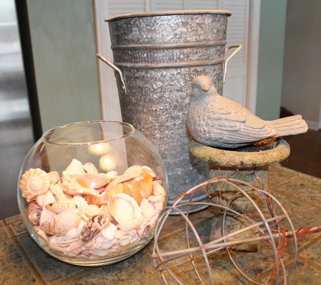 I’m backtracking today, to a couple of weeks ago when I hit so many awesome estate sales that I decided to write three installments. I got a little sidetracked by the holidays, but I’m back with the final installment. Above you can see the fish bowl (for a springtime cement orb project), filled with sea shells (love!), the galvanized steel flower container (I embellished it here: Numbered Burlap Labels), small mossy urn with large gray bird, and the wire garden globe-y ornament. Can’t wait for spring!