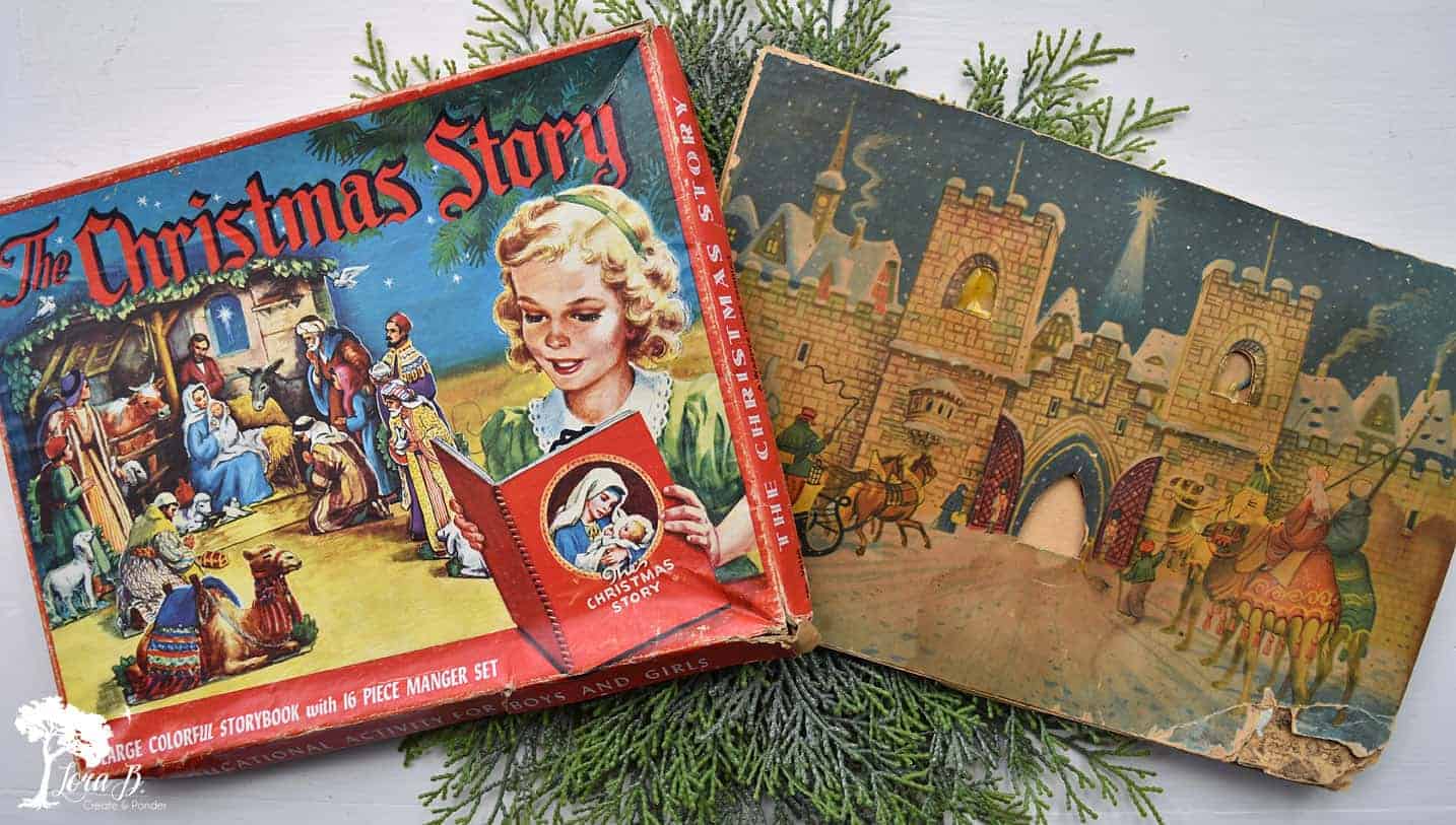 The brightly colored “Christmas Story” box (above left) dates to 1952. It was manufactured in America by Warner Press, which is still in existence.