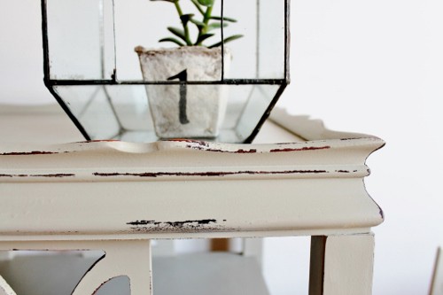 Fossil is one of my favorite colors. Great job on distressing the scalloped edges. I was going to ask what AnnMarie did – have you tried Krylon Chalky Finish in a spray can? I painted all weekend with it. Love it. Pinning and sharing the table.