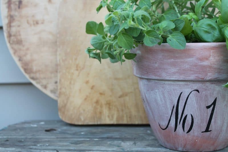 I stenciled this white-washed terra cotta pot with “No 1,” filled it with herbs, and gave it to my sister for her birthday.