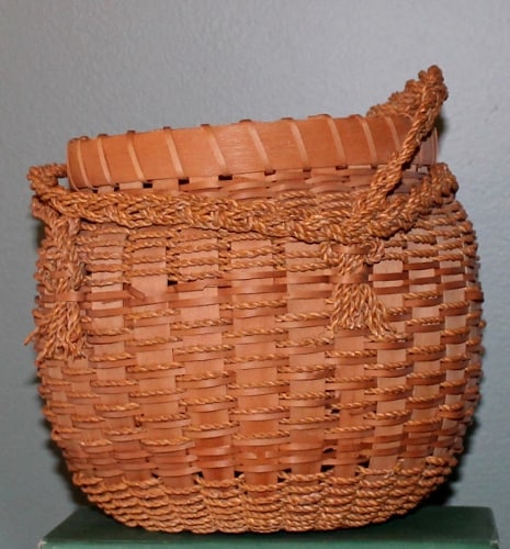 I can’t decide the purpose of this antique basket; it’s so small. It has two long woven handles that are currently wrapped around the top. It had been stored awkwardly and the handles are all bent out of shape. Could it have been a pocket book? I’m just not sure, but I love the alternating thin reeds with the twisted fibers. It’s quite a unique look. This is another of the items gifted to me by my friend.