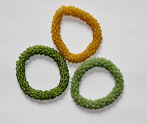 These bangles aren’t vintage, but somehow they have a vintage vibe. The green and yellow are close to Bakelite colors. I picked them up at a moving sale for $1.00 and plan to keep them, presuming I find something to wear them with.