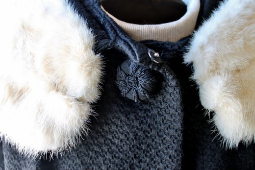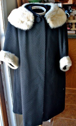 It has 3/4 sleeves and a nice bit of “swing” at the bottom. The pure white fur (of unknown origin–mink?), is an added bonus, as often one finds plainer brown fur collars and cuffs. My sweet son listed it on eBay for auction, with a Buy It Now of $45.00.