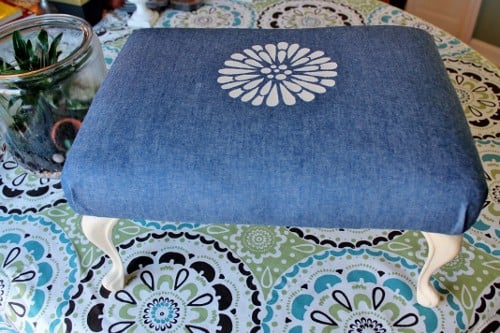 Hi everyone! Based on suggestions from my readers, I made a change to yesterday’s project. I had recovered an old stool with some denim and stenciled a chrysanthemum in the center, but the brassy legs just didn’t compliment the new look. Multiple readers and blogger friends suggested that I paint the legs.