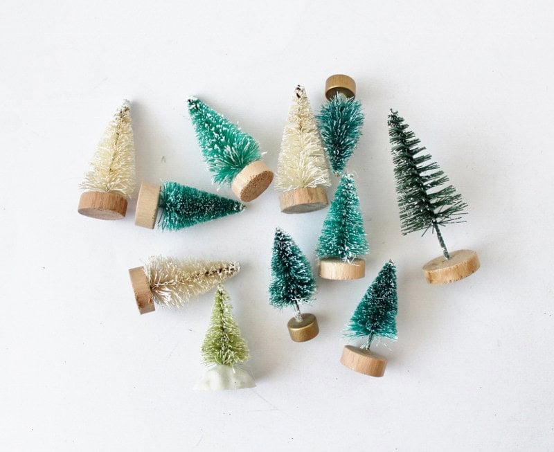 These tiny evergreens can often be found at Dollar Stores, and the white ones I pick up on Amazon.